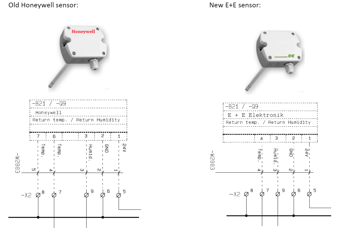 From the beginning of February 2018, the original Honeywell humidity / temperature duct sensor for DanX has been changed for a E + E Elektronik duct sensor. As the characteristics of the temperature sensor has been changed from an NTC (Honeywell) to a 0-10V (E+E) signal, not only the sensor has to be changed, but also the software of the controller. Alternatively, if only the temperature or humidity sensor as failed, andyou do not have the possibility the change the software of the controller, you could also do the following: Temperature sensor has failed: You can buy a NTC duct temperature sensor (Dantherm spare part no. 097356), disconnect the cables at terminal 6 and 7 and connect these to the new temperature sensor. In this case the old sensor acts as the humidity sensor and the new as temperature sensor. Humidity sensor has failed: You can buy the new E+E duct sensor, disconnect the cables at terminal 1, 2 and 3 on the old Honeywell and connected these to the same terminals on the new sensor. In this case the old sensor actsas the temperature sensor and the new as humidity sensor. Electrical connection: